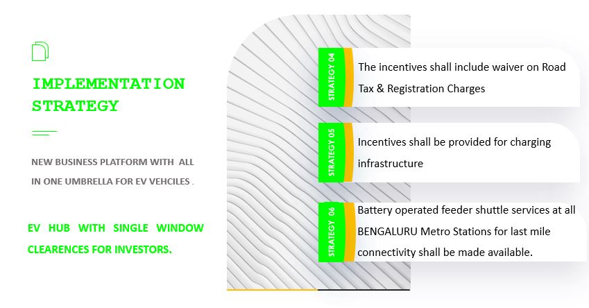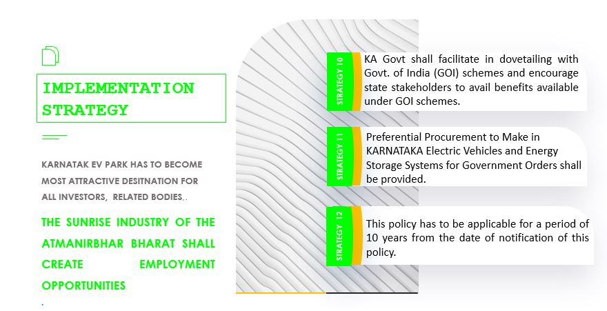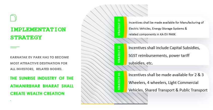 - The framework consists of promoting EV adoption for end users, setting up of Charging Infrastructure and Promoting Manufacturing of EV & ESS Components in the KA EV PARK.