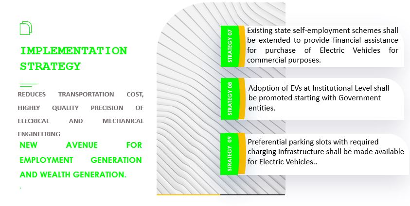 To make the State an attractive investment destination for this sector To promote R&D and manufacturing in Electric Vehicle & Energy Storage Systems’ sector. To ensure faster adoption of Electric Vehicles & Energy Storage Systems in the State To achieve substantial reduction in total cost of transportation for personal and commercial purposes, supported by a world-class infrastructure manufacturing facility for the investors hub