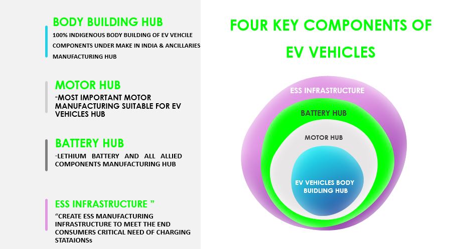 - EV Park will develop exclusive major auto manufacturing hubs and also in areas which have potential to attract E V investments.